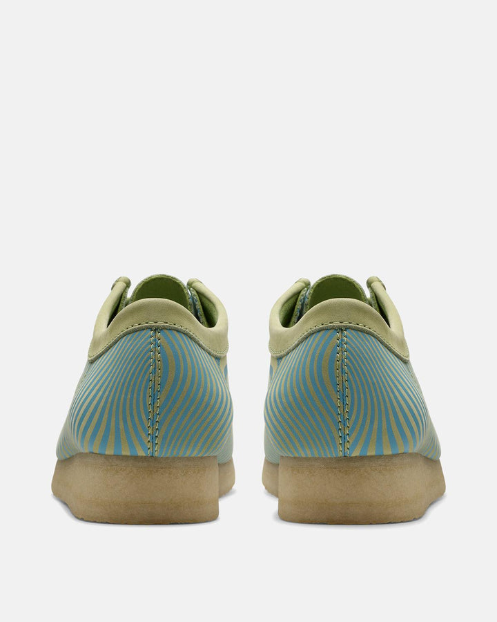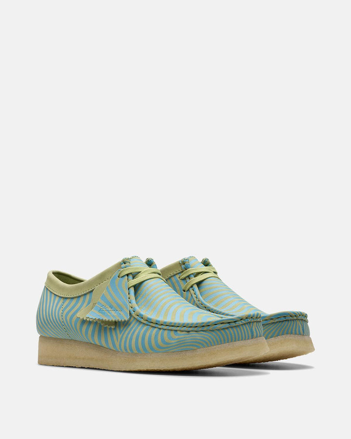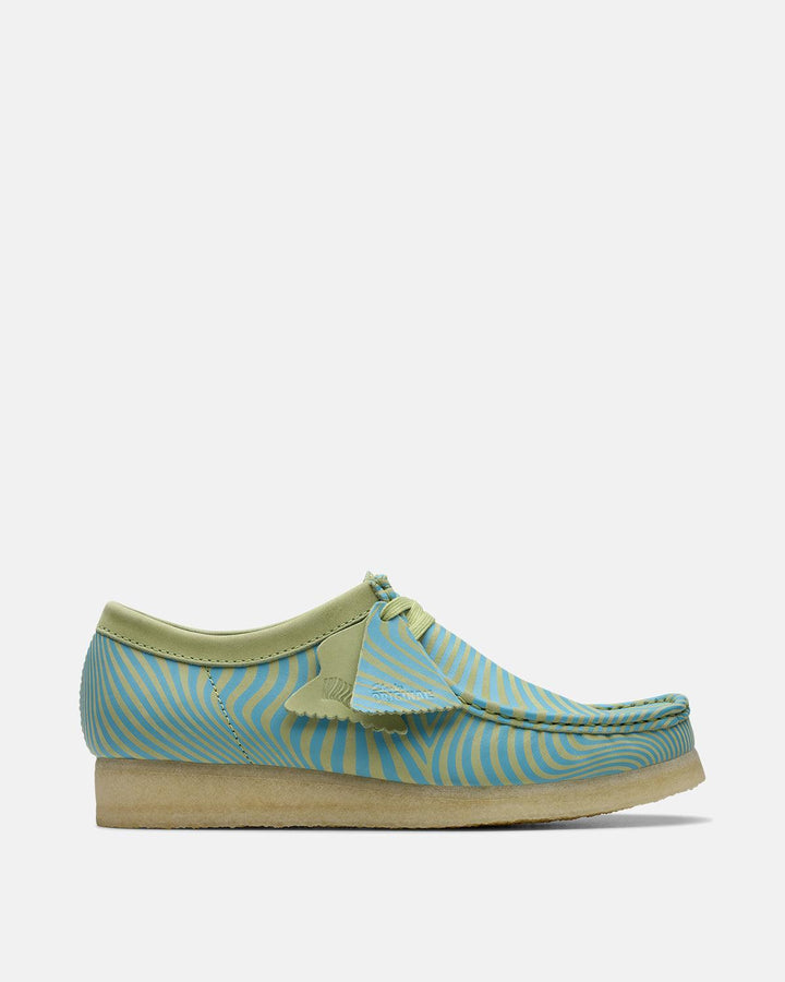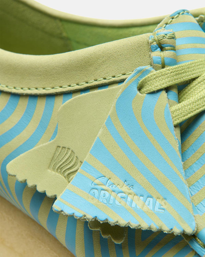 Inspired by bold moves of a 90s dancehall, Clarks' legendary Wallabee makes the perfect backdrop to their new swirly print. Buttery nubuck in blue and lime green make a statement this summer, and their iconic crepe soles balance each pair perfectly. Complete with a sleek leather, collar fobs and laces - it’s all in the details.